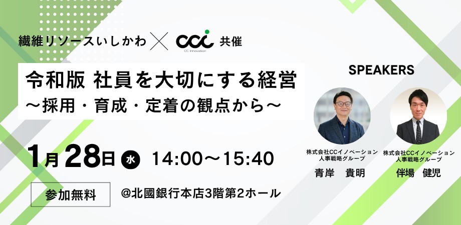 今回は、㈱繊維リソースいしかわは、北國銀行グループの㈱CCイノベーションと共催で「令和版社員を大切にする経営~採用・育成・定着の観点から~」セミナーを開催しますのでご案内いたします。